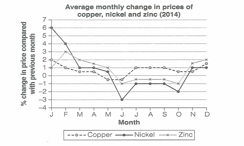 The graph below shows the average monthly change in the prices of three metals during 2014.